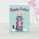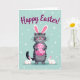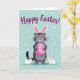This card shows a gray, striped cartoon cat wearing oversized pink bunny ears 🐰, smiling with closed eyes and rosy cheeks as it holds up a large decorated egg like a sweet offering to a friend. The egg is oval and bright pink with white stripes and dotted accents, centered in the cat’s paws so it feels like a shared gift. Behind them, a soft pastel blue background is sprinkled with small white circles that look like confetti drifting down. At the bottom, two tiny white rabbits sit close together, their pink inner ears and little noses echoing the cat’s ear color 🐇. The cat’s gentle grin and the rabbits’ snug placement create a cozy, affectionate scene without needing any extra props. The greeting “Happy Easter!” is placed across the top in deep purple lettering that curves slightly as it spans the width. The overall layout is simple and airy, with the characters centered and the pale dots evenly scattered across the blue backdrop.