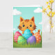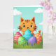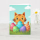 This design shows an orange, striped cat with big golden eyes peeking from behind tall green grass, holding a blue egg with a repeating pattern close to its chest as if it’s a small gift meant for someone special 🌷. Nearby, several decorated eggs sit nestled in the greenery, including a fuchsia one with white stripes, an emerald one with lighter green markings, a soft lavender one, and an orange one dotted with creamy spots. The cat’s slight smile and the way it leans forward give the scene a friendly, almost flirty closeness, like it’s sharing a secret discovery with a companion. Above the meadow, a bright blue sky stretches across the background with rounded white clouds drifting overhead. The colors stay lively and springlike, with gentle shading that gives the grass and eggs a bit of depth without looking heavy. A short Easter greeting appears near the top in light-colored lettering that stands out against the sky, keeping the message easy to spot 🐰. The foreground is packed with blades of grass framing the cat and eggs, and the blue patterned egg is centered between its paws.