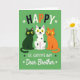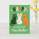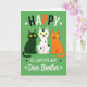 On the front of the card three stylized, front-facing cats sit in a neat row on an emerald green background, their wide smiles and bright yellow eyes giving each other a friendly, close-knit look 💚. A deep green cat is on the left, a white cat with dark green spots sits in the center, and an orange cat is on the right, creating a tidy color flow across the page. Their simple shapes and small whisker details keep the scene easy to read while still showing personality. At the top, the word “HAPPY” appears in large all-caps letters, with colors alternating between black, orange, and cream. Near the lower middle, “ST. CATTY’S DAY” is set in crisp white capital letters, standing out sharply against the green. A smaller “Dear Brother” appears in white, placed below the main title line as a gentle, affectionate note between the sender and the recipient ☘️. White asterisks and small black shamrocks are scattered around the cats, filling the space like confetti across the background.