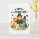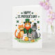 This card shows five cats celebrating St. Patrick’s Day on a bright white background, with a friendly, cozy energy between them 💚. Three larger cats stand in the back like a cheerful group photo, led by an orange cat dressed in a green leprechaun outfit with a fluffy ginger beard. Beside him, an orange tabby and a gray cat wear green bow ties and tiny top hats, leaning in close as if they’re in on the same joke. In front, two smaller kittens—one white and one gray-striped—paw at shiny gold coins, their little faces turned toward each other like they’re sharing a secret find ☘️. Emerald greens, warm oranges, and soft grays carry the color story, while scattered shamrocks and floating coins fill the open space around the cats. The words “HAPPY ST. PATRICK’S DAY” sit across the top in green, centered above the group like a header. The smallest white kitten grips an oversized gold coin near the bottom of the scene, with a few more coins and shamrocks drifting nearby.