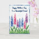 Designed with a gentle watercolor look, this greeting card feels like a quiet note of affection shared between close hearts ❤️. Near the top, a large flowing message in dark blue sits centered, drawing the eye before anything else. Beneath it, a wide horizontal band stretches across the card like a garden path where tall flower spikes stand side by side, leaning as if in friendly conversation. The blossoms alternate in bright blue, soft pink, and calm purple, each one perched on thin green stems that rise from a strip of lively green grass. The background stays mostly white with a light wash of pale blue, like a clear morning sky that keeps the scene airy and open 🌼. A deep blue painted frame outlines the edges, slightly uneven in a way that makes the border feel brushed on by hand. The text remains in the upper area while the flowers fill the lower half, creating a balanced layout that feels tender without trying too hard. Along the outer edge, the deep blue border forms a loose rectangle with softly feathered corners and visible brush texture.