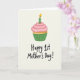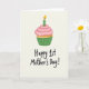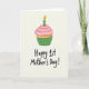 This card shows a digital illustration of a cupcake centered near the top of a soft off-white background, setting a gentle, cozy scene. The cake base is warm golden-yellow, topped with a tall swirl of light pink frosting dotted with tiny pale specks that make it look creamy and sweet ❤️. A bright green candle rises from the frosting, and its thin stripes echo the cupcake wrapper for a matched, close-together look that feels like a caring gesture. The wrapper is a rich green with fine vertical lines, adding a neat, classic touch without feeling stiff. Beneath the cupcake, the text “Happy 1st Mother’s Day!” sits in dark lettering, placed low and centered so the message feels like it’s being offered up with a quiet smile 🌼. Soft pastel pinks, greens, and sunny yellows keep the mood tender, like a small celebration shared between close hearts. The candle flame is golden-orange and teardrop-shaped, glowing above the frosting against the pale background.