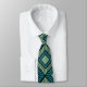 This tie has an art deco design of diamond shapes with diagonal lines and colored diamonds in two shades of teal.