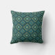 This throw pillow has an art deco design of diamond shapes with diagonal lines and colored diamonds in two shades of teal.