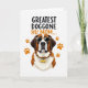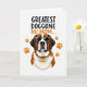 This card features a front-facing portrait of a multi-toned dog centered on a bright white background, with warm browns, creamy whites, and deeper accents shaping its coat. The dog wears dark sunglasses with a spotted pattern, giving it a cool, affectionate look that feels like a friendly wink ❤️. Around its neck sits a matching patterned collar, and a small golden, bone-shaped tag dangles at the front like a token of devoted companionship. On both sides of the dog, several orange paw prints float outward, adding motion and a cozy, together-forever feel. Near the top, a short message appears in loose, hand-drawn lettering, set in a dark color that stands out sharply against the white space. The text is placed above the dog’s head, leaving the center clear so the face and accessories stay the main focus. Small pops of orange—especially in the paw prints—bring a sunny touch 🌼 to the otherwise earthy palette. The sunglasses sit squarely across the dog’s eyes, and the golden tag catches the light just below the collar.