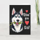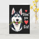 This card features a black background with a large, friendly dog-like character on the left, drawn in black and white with soft pink inside the ears. Its bright blue eyes look outward with an eager, affectionate sparkle, and its open mouth feels like a happy grin shared with someone close ❤️. A thin branch with several plump green olives stretches from its teeth toward the right side, like a cheeky little offering between friends. On the right half, a short message appears in white lettering, set in a neat, easy-to-read style and stacked to balance the illustration. Two small red heart icons sit near the words, adding a gentle romantic touch without overpowering the simple layout. The smooth shading and strong outlines keep everything crisp while letting the dog’s gaze and the olive branch do most of the talking. The olives are a yellow-green tone, and the hearts are a deep red, standing out sharply against the dark background 🌼.