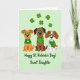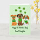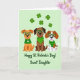 This card shows three cheerful dogs sitting in a tidy row on a mint-green background, with five shamrocks scattered around them for a festive touch ☘️. One pup is golden-brown, the next is deep cocoa, and the third is brown-and-white, and they all wear oversized emerald-green glasses that make their bright eyes look even more affectionate. The left dog wears a deep-green sweater with a large white four-leaf clover on the chest, leaning slightly toward the middle dog like a close friend. The cocoa-colored dog has a green striped bandanna at its neck, sitting calmly as if enjoying the company on either side. The brown-and-white dog finishes the lineup in a green jumper with horizontal stripes, its smile turned toward the others in a sweet, companionable way 💚. Centered near the bottom, the message “Happy St. Patrick’s Day! Sweet Daughter,” appears in bold green lettering, set just below the dogs. The overall palette stays in soft greens with crisp details, and the shamrocks float like small cutouts across the upper area of the design.