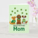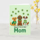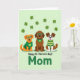 Designed with three anthropomorphic dogs sitting side by side, this St. Patrick’s Day illustration feels like a friendly little group photo full of shared glances and easy closeness 💚. The left dog has orange fur and wears a green sweater with a large shamrock centered on its chest, looking outward as if posing proudly for someone it adores. In the middle, a shaggy brown dog leans in with a relaxed, companionable look, wearing a green bandana marked with a small clover. On the right, a brown-and-white dog in a green-and-white striped jumper sits neatly, and the three of them match with round spectacles that make them look like a tight-knit trio. Behind them, a lime-green background is sprinkled with small four-leaf clovers that float across the scene like confetti ☘️. Along the bottom, the phrase “Happy St. Patrick’s Day!” appears in large, friendly lettering, with “Mom” set bigger just beneath it, both in dark green against the bright backdrop. The lime-green field fades slightly lighter toward the center, while the scattered clovers dot the space around the dogs’ heads and shoulders.
