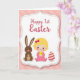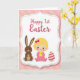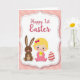This greeting card shows a stylized baby with bright blonde hair in a rosy pink outfit, centered inside a scalloped white frame, smiling softly as she cradles a tiny yellow chick. To her left sits a friendly brown long-eared bunny 🐰, and to her right rests a cream-and-rose striped egg, balancing the scene like close companions. The baby’s wide eyes and the careful way her hands cup the chick add a tender, affectionate note, like a sweet moment shared with someone dear. Behind them, a pastel pink background with a faint geometric pattern keeps the setting gentle and light. Near the top, the words “Happy 1st Easter” appear in a flowing coral-colored style, standing out clearly against the pale backdrop. A fine dotted border circles the central picture, adding texture while keeping attention on the figures. Rounded shapes and soft curves repeat across the frame, the bunny 🐇, and the egg for a cozy, friendly look. The chick is a bright butter-yellow spot of color against the baby’s pink outfit and the white scalloped edging.