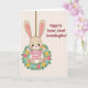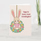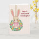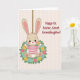 Designed with a sweet spring scene, this card features a cartoon-style long-eared bunny with cream fur, rosy cheeks, and wide dark eyes that seem to gaze out with gentle affection 🐰. Its tall ears show soft pink inside, and it wears a red-and-white striped outfit that adds a cozy, friendly touch. The bunny sits snugly inside a circular green wreath, as if being hugged by leaves and blossoms like a warm hello from someone close. Around the ring are stylized flowers in soft yellow, light blue, and bright pink, arranged to feel like a cheerful garden frame 🌷. The whole wreath appears to hang from a braided rope at the top, giving the layout a little depth against the flat illustration style. The background is warm muted beige with a faint grid texture that stays subtle behind the main art. On the right side, the message “Happy 1st Easter, Great Granddaughter!” is set in deep red lettering, stacked in short lines so it reads clearly beside the wreath. The rope hanger is centered above the greenery, with the beige grid faintly visible across the open space behind the bunny and flowers.