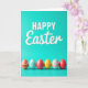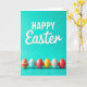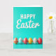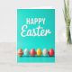 This card features a spring holiday greeting set on a smooth teal background, with the word “HAPPY” centered near the top in large white uppercase letters. Just beneath it, “Easter” appears in smaller white cursive-style lettering, creating a gentle contrast that feels friendly and close. There are no characters, but the layout suggests togetherness, like two voices speaking in one shared message 🐰. Along the bottom third, six decorated egg shapes sit in a neat row, as if lined up for a small exchange between friends. Their patterns vary from multicolored horizontal stripes to red-and-yellow dots, plus blue-and-white stripes and zigzag details, adding charm without crowding the space 🌷. Soft lighting adds faint shadows under each egg, giving them a slightly raised look. The teal field stays uncluttered, and the eggs show crisp edges with alternating bands, dots, and zigzags across their shells.