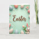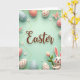 This card features a spring scene in soft pastel tones, framed by a border of decorated egg shapes around a calm mint-green center. In the middle, the word “Easter” appears in a flowing cursive style, colored warm chocolate-brown and set against a faint pattern of thin geometric lines. The eggs show varied designs, including white stripes over sky blue, small red flower motifs on creamy white, and yellow blossoms on a gentle pink surface, each shaded to look slightly raised. Tiny white flowers are sprinkled between the eggs, and soft pink winged insects drift nearby like quiet companions 🌷. At the lower right, a cute white bunny-like character with long ears and rosy cheeks leans in with a welcoming smile 🐰. It holds a thin green stem as if offering it to someone just outside the frame, adding a tender, friendly touch to the scene. The stem ends in an egg-shaped bloom shaded in pale pink with a small leaf tucked beside it.