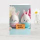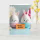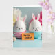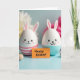 This card shows a spring still life with two egg-shaped figures that have upright bunny ears with soft pink interiors 🐰. The left figure has horizontal pink stripes along its lower half, a wink, and rosy cheeks, leaning slightly toward its companion in a friendly, flirty way. The right figure has a light blue base and an open-eyed smile, facing the other as if sharing a quiet joke 🐇. In the foreground, an orange note sits between them, with a short greeting printed in darker lettering across the center. The scene rests on a smooth sky-blue surface, keeping the pastel palette calm and gentle. Behind them, the background fades into a soft blur of creamy white and bright fuchsia flowers, like an out-of-focus garden. A few small, natural-toned oval shapes lie low near the bottom edge, partly tucked beside the orange note.