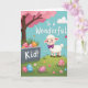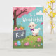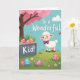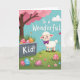 This greeting card features a fluffy white lamb with a soft textured coat and a purple bow tie, gazing forward with wide eyes and a gentle smile that feels like a friendly hello. Beside it stands a sturdy tree filled with pale pink blossoms, its branches stretching into a robin’s-egg blue sky where one small white cloud floats. The grassy hill rolls across the foreground, dotted with tiny wildflowers in pink, blue, and yellow, like little notes left for someone special 🌷. Bright orange and magenta butterflies drift through the scene, adding movement around the lamb as if they’re circling an affectionate meeting. Pastel-striped eggs sit in a gray planter under the flowering tree, with more eggs scattered casually in the grass like a shared treasure hunt 🐰. White lettering appears partly in the sky and again on the planter, placed so it frames the scene without covering the characters. The planter rests beneath the blossom-heavy tree, with striped eggs tucked inside and more eggs spread across the green lawn among the small flowers.