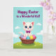 This card features an anthropomorphic white cat with big blue eyes and a faint pink blush, wearing a magenta bow tie that adds a sweet, friendly touch. The cat sits snugly in a rustic woven basket, leaning close to a cluster of decorated eggs as if guarding them for someone special. The eggs are painted in pink, blue, and yellow with stripes and polka dots, creating a cheerful spring look 🌷. Behind them, a rolling green meadow dotted with tiny white flowers stretches toward a pastel blue sky, where soft clouds drift by. A tender, trusting gaze from the cat and the cozy basket setting suggest a gentle bond, like a small shared moment between friends. Near the top, rounded magenta text is centered against the sky, standing out clearly without crowding the illustration 🐰. Soft, diffused light highlights the cat’s fluffy fur and the basket’s textured weave, while the patterned eggs gleam in the foreground. The scene is framed by the green hillside below and the cloud-filled blue sky above, with the magenta lettering hovering overhead.