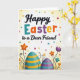 This design shows a vertical digital illustration with a soft yellow background that fades lighter toward the center, like early spring light. Near the top, the greeting “Happy Easter to a Dear Friend” sits inside a cloudy white vignette, with the words in teal, purple, and orange, plus a flowing black cursive line for contrast 🌷. The lettering feels friendly and close, like it was written with someone special in mind. Beneath the text, two large egg shapes anchor the scene, leaning visually toward each other in a cozy, companionable way 🐰. The left egg has wide horizontal bands of yellow and teal, while the right egg alternates purple and teal stripes, both with a lightly brushed texture. Curly black stems and simple floral shapes surround them, mixing orange, deep purple, and teal leaves with tiny star-like centers. Small stars and dots in fuchsia, gold, teal, and orange are scattered across the pale yellow space.