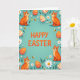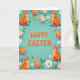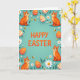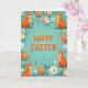 This greeting card features a cool teal background with large orange text reading “HAPPY EASTER” placed right in the center. Around the edges, four bright orange cats with stripe markings sit near the corners, each looking upward with wide eyes and a soft smile that feels like a friendly, shared secret between companions. Decorated egg shapes float nearby in orange and white, some with polka dots and others with stripe patterns, adding a festive spring touch 🌷. White, many-petaled flowers with warm yellow centers and small sprigs of green leaves fill the open spaces like a gentle garden border. Tiny striped insects hover between the flowers and eggs, giving the scene a light sense of motion, as if the cats are watching them together. A few small, pale oval shapes are scattered throughout to balance the layout and keep the eye moving 🐇. The orange headline stays crisp against the teal field while the cats, eggs, flowers, and insects form a tidy frame around the center text.