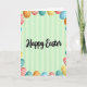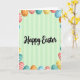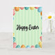 This design shows a centered “Happy Easter” message in dark lettering, set inside a thin decorative frame. Behind the words, the background is filled with vertical mint-green stripes that alternate between very light and slightly deeper tones for a fresh spring look 🌷. Around the edges, pastel egg shapes peek in from all sides, as if they’re leaning closer to join the greeting like friendly companions 🐰. The eggs come in soft pink, yellow, orange, blue, and teal, and their gentle shading gives them a rounded, touchable feel. White patterns on the eggs—polka dots, wavy lines, and diagonal stripes—add variety without crowding the center. The text sits comfortably in the middle with plenty of open space, while the border elements create a cozy, close-together frame that suggests a sweet, affectionate exchange. Along the perimeter, several eggs are partially cropped so only their curved edges and patterned tops remain visible.