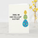 This card features a graphic illustration on a soft, creamy off-white background, using sunny spring colors that feel friendly and close. On the left side, the message “HAVE AN EGG-CELLENT EASTER!” is set in large, hand-drawn-style lettering, stacked in a neat arrangement and colored in a dark tone for strong contrast. The words sit comfortably with plenty of open space around them, like they’re leaning toward the artwork as if starting a cheerful conversation 🐰. On the right, three decorated oval egg shapes are stacked vertically, creating a balanced layout that reads like a little totem of shared celebration. The top egg is warm golden yellow with subtle diagonal lines, giving it a gentle, brushed texture. The middle egg is bright green with purple zigzags and scattered pink and yellow dots, like a lively pattern exchange between friends 🐇. The bottom egg is deep blue with contrasting circular spots in orange, pink, and purple, and all three eggs have crisp edges and flat color fills.