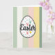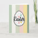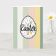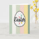This card features a large egg-shaped oval outlined in black, centered over soft vertical stripes in muted sage green, creamy white, blush pink, and buttery yellow. Inside the oval, the word “Easter” appears in smooth black lettering, placed prominently across the middle. Around the text, small round dots in gentle coral and cool aqua drift like confetti, adding a light, friendly rhythm. Mixed in are simple bunny-ear shapes in the same pastel tones 🐰, some leaning toward each other as if sharing a quiet, affectionate moment. The overall layout feels calm and welcoming, like a spring greeting passed between close friends. In the lower right of the oval, a tiny yellow chick with small dark legs stands near a cluster of dots, bringing a sweet touch of motion 🐇. The black outline of the oval stays crisp against the soft striped background, and the pastel ears and dots are scattered evenly around the central word. A small yellow chick sits near the lower-right edge of the oval beside coral and aqua dots.