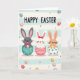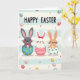 This design shows three friendly rabbits popping up from cracked eggshells, leaning close as if sharing a private joke 🐰. In the middle, a white rabbit wears a small pink bow and looks calmly toward the viewer with a soft, affectionate expression. To one side, a gray rabbit in a red bow tie tilts its head toward the center, while a tan rabbit nestles in a shell decorated with tiny blue star shapes 🐇. Their rosy cheeks and wide smiles make the trio feel like close friends posing together. Behind them, the background is made of pale blue and cream stripes, with scattered pastel eggs and tiny dot accents that drift around the scene. Near the top, “HAPPY EASTER” sits in large, hand-drawn uppercase letters in a dark tone that stands out against the light stripes. The eggshell edges are jagged and lightly shaded, with little cracks and chips visible around each opening.
