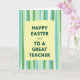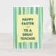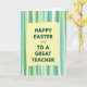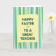 Designed with a soft spring look, this Easter card centers on a pale yellow rectangular panel with gently uneven edges, like a note shared between friends 🌷. The warm yellow area sits over a background of vertical stripes in deep green, mint, teal, and sky blue, with thin white streaks running through. In the middle of the yellow panel, dark green text reads “HAPPY EASTER,” followed by a small wavy line, and then “TO A GREAT TEACHER,” all neatly stacked and easy to spot. The slightly irregular edges and painterly stripe texture give it a relaxed, human touch, as if someone took extra care while thinking of the reader 🐰. The cool greens and blues around the sunny center create a gentle contrast that feels like a calm, appreciative exchange. The lettering stays centered and balanced, with the wavy line acting like a small pause between the two lines of text. Behind it all, the stripes vary in width and brush texture, moving top to bottom in alternating greens and blues with narrow creamy-white lines. To share Easter sentiments.