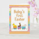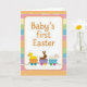 This greeting card features a white rectangular panel centered on the front, edged with a dotted orange border that adds a light, friendly touch. Inside the panel, the words “Baby’s first Easter” appear in rounded orange lettering, placed neatly near the top so the message reads first. Along the lower area, a small train rolls across with three simple animal riders, arranged as if they’re traveling together like close friends on a spring outing 🐰. The first wagon holds a yellow duckling, the next carries a brown long-eared bunny 🐇, and the last shows a fluffy white lamb, each sitting snugly in a brightly colored car with contrasting wheels and thin black connector lines. Behind them, the background is filled with horizontal pastel stripes in soft pink, yellow, green, and blue, with slightly uneven edges that give the scene a gentle, textured look. Wide orange bands frame the top and bottom, keeping the layout balanced and drawing the eye back toward the center. The train cars are bright and simple, with the animals facing forward against the layered pastel stripes and orange borders.