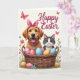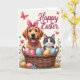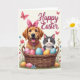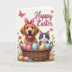 This card shows a golden dog with a rosy pink bow and matching collar leaning close to a fluffy gray-and-white cat, their faces turned forward with a tender, friendly closeness. The dog’s wide smile and bright eyes feel like an eager greeting, while the cat’s calm amber gaze adds a gentle, steady presence. In front of them sits a woven basket filled with pastel eggs in pink, blue, and yellow, decorated with stripes, dots, and small floral shapes. Soft light falls across a creamy white background, making the spring colors stand out without feeling loud. Near the top, a short Easter message appears in flowing cursive-style lettering, set in a dark tone that’s easy to read. Around the upper area, a couple of pink butterflies drift by, and a few tiny blossoms peek out like little notes of affection 🌷. Along the bottom edge, green grass frames the basket with scattered blue and pink flowers, and the eggs show fine pattern details beside the animals’ soft fur 🐰.