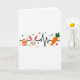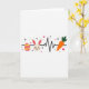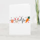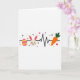 Designed with a bright spring look on a white background, this card centers on a thin black line that runs straight across like a heart monitor trace, linking three simple icons. On the left sits an oval egg shape with pink and yellow stripes, like a little treasure found on a sunny morning 🌷. In the middle, a round bunny face 🐰 with upright ears smiles softly, and the rosy cheeks give it a sweet, friendly look, like it’s sharing a quiet moment with you. The inner ears are tinted pink, adding warmth that reads like gentle affection without needing extra details. On the right, an orange carrot with a leafy green top leans into the line, balancing the layout like a small gift offered between friends. Tiny red hearts are scattered around the main shapes, with a few small black flower silhouettes tucked in to frame the scene. Near the center, the bunny’s pink inner ears sit above its curved smile, while the little red hearts float nearby against the white space.