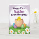 Designed with a springtime scene, the card centers on a small yellow feathered chick with wide eyes and a tiny orange beak, peeking out from a cracked eggshell as if greeting someone dear. It sits on rolling green grass sprinkled with simple white, daisy-like flowers with orange centers, adding a gentle, friendly warmth 🌷. Around the chick are several egg shapes decorated with neat horizontal stripes in blue, lavender, green, and orange, creating a cheerful frame like close companions gathered nearby 🐰. The background fades through a pale violet gradient, and a soft white circle behind the chick acts like a spotlight that draws your eye in. Near the top, rounded purple lettering spells out the Easter message, centered and easy to read against the lighter sky. The careful spacing leaves the illustration open and airy, letting the chick and patterned eggs feel like they’re sharing the moment together. The striped eggs sit at varying angles around the chick, while the broken shell pieces curve outward on the grass beneath it.