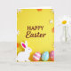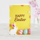 This card features a sun-yellow background that sets a bright spring setting, with “HAPPY Easter” centered near the top in deep maroon lettering. The words sit above a small scene along the lower area, where a simple white bunny 🐰 rests on the left with fuchsia-pink inner ears and a tiny dot eye. To the right of the bunny are three decorated eggs, grouped close together like friends leaning in for a photo. One egg is pastel pink with thin white diagonal stripes, the next is aqua with small white dots, and the third is a deeper magenta with matching white dots. White and warm orange flower shapes 🌷 are scattered around the upper and side edges, giving the layout a gentle frame. The spacing keeps the message easy to read while the lower illustration feels close and companionable, like a quiet shared moment. Small multi-petaled blossoms in white and orange float near the corners against the yellow field.