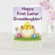 This card features a sweet spring scene with a fluffy yellow chick peeking out of a cracked eggshell, its tiny wings slightly open as if reaching toward a friendly hello 🐰. The chick’s wide eyes and gentle tilt of its head give it a tender, companionable look, like it’s being welcomed into the day. Around it, bright green grass rises in soft blades and nestles three glossy egg shapes decorated with magenta stripes, calm blue bands, and warm golden accents. On the left side, a white daisy with a sunny yellow center leans in close, adding a quiet, affectionate touch to the setting 🌷. Along the bottom, a lightly textured strip carries a faint floral pattern that grounds the illustration without distracting from the main figure. At the top, a soft lavender gradient background holds a curving message in purple lettering centered near the upper edge. The decorative eggs catch small highlights, and the chick’s shell pieces sit open in pale, speckled halves beneath its fluffy body.