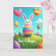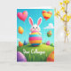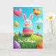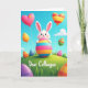 This card shows a spring scene with a cartoon-style white rabbit at the center, its pink-lined ears upright as it gives a wink that feels like a friendly inside joke 🐰. The rabbit hugs a tall egg held close, as if it’s sharing a sweet secret with the viewer. The egg is striped in bright pink, sky blue, sunny yellow, and orange, standing out against a green hillside with simple tufts of grass. Above, a clear blue sky with soft clouds is filled with floating balloons, including two heart shapes that hint at affection and camaraderie 🌷. One heart balloon is pink with small star shapes, while another mixes warm colors in stripes, and nearby oval balloons show dots and bands in greens and magentas, each tied with thin strings. Near the lower portion, the words “Dear Colleague” appear in a casual hand-lettered style in a darker tone that contrasts with the grass. More decorated eggs in purple, orange, and electric blue are scattered across the foreground, with soft shading and highlights giving them a gently rounded look.