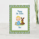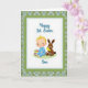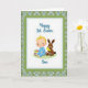 This card features a soft digital illustration centered on a white rectangular panel, where a rosy-cheeked baby in a calm blue outfit sits with bright blond hair and wide, content eyes. Beside the baby, a small brown long-eared bunny leans in close, gently holding a tiny yellow chick as if sharing a quiet, friendly moment 🐰. A decorated egg rests nearby, covered in stripes and small star shapes in several colors, adding a festive spring touch 🌷. The white panel is bordered by a scalloped green frame dotted with tiny white specks, giving the scene a cozy, tucked-in look. Behind it all, the background is a tartan-style plaid in muted blues and greens, adding texture without overpowering the characters. A short greeting appears as flowing lettering near the top of the central panel, set in a darker tone that stands out against the white space. The overall layout keeps the figures close together, with their gentle angles and soft expressions suggesting affection and companionship. The plaid pattern shows intersecting lines in blue-green shades, forming neat squares around the central framed panel.