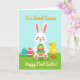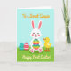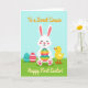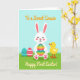 This card shows a simple spring scene with a white bunny centered on the front, its pink cheeks and paw pads adding a sweet, friendly touch 🐰. The bunny hugs a large striped egg, and the bright bands of teal, green, yellow, orange, and red make it feel like a shared treat between friends. A tiny yellow chick stands close on the bunny’s right side, looking up with a gentle, attentive gaze that suggests easy companionship 🐇. On the left side near the bottom, two extra eggs rest in the grass, one teal with dark zigzag lines and the other red with small white decorative marks. A short greeting in dark lettering sits above the bunny against the sky, and a second line of text appears below near the grass line in a matching color. The setting is a field of textured green grass that meets a wide, light blue sky, keeping the focus on the characters and their closeness. Soft lighting and rounded shapes give the scene a calm, affectionate look without feeling busy. The foreground shows the teal zigzag egg and the red patterned egg nestled low in the green grass beneath the bunny’s paws.