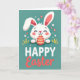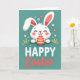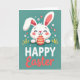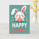 This card shows a white, friendly bunny with long ears and rosy cheeks peeking down from the top edge, eyes closed in a wide smile that feels like it’s meant for someone special 🐰. Its small paws rest on a gently curved patch of muted yellow-green grass, as if it’s leaning in closer like a fond hug. Tucked against its chest is an oval egg decorated with warm red stripes and golden bands, dotted in an alternating pattern that adds a sweet, festive touch. The background is a soft teal field sprinkled with tiny flower shapes in white and coral red, giving the scene a light, springtime lift 🌷. Near the lower portion, the word “HAPPY” appears in rounded white letters, standing out clearly against the teal. Just beneath it, the holiday word is written in a flowing coral style, slightly larger and more decorative, like a gentle flourish under the main greeting. The bunny and egg sit above the text, centered so the character’s cheerful face draws your eye first, with the scattered flowers floating around to frame the scene.