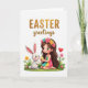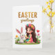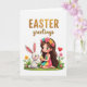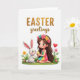 This card shows a dark-haired cartoon-style girl kneeling on a white background, wearing a flower crown in pink, yellow, and teal, and looking at a chubby white rabbit with rosy cheeks 🐰. She’s on a small patch of green grass, and her pastel striped outfit in teal, yellow, and fuchsia adds a sweet, friendly tone to the scene. Between them, she holds a striped egg-shaped decoration in sunny yellow and soft blue, angled toward the rabbit as if offering it to share. The rabbit leans in with tall ears perked, giving the moment a gentle, affectionate closeness like two friends trading a small surprise 🐇. Tiny pink and yellow flowers dot the green foreground, framing the pair without crowding them. Near the girl and rabbit, a small red heart floats to the side, hinting at a tender bond. Across the top, a seasonal greeting appears in gold lettering, centered and spaced above the illustration. The gold text sits over the open white space while the girl, rabbit, scattered flowers, and red heart cluster neatly in the lower half.