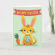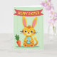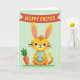 Designed with a springtime scene, the front features a cute cartoon bunny with long ears and wide, friendly eyes, set against a light mint-green background with tiny dashed accents. Warm yellows and oranges color the bunny’s fur, and its rosy cheeks and faint stripes add a tender, companionable look 🐰. Nestled in its paws is a pale blue oval with soft stripes, held close as if it’s a little gift meant for someone special. Beside the bunny stands an orange carrot with a leafy green top, upright like a cheerful sidekick that balances the composition 🌷. Across the top, a curved red banner stretches from side to side, carrying bright yellow lettering centered neatly on the ribbon. The lighting stays soft and even, keeping shadows minimal and the shapes easy to read. Fine details show in the bunny’s small paws and the gentle striping on the blue oval, while the carrot’s green crown fans upward in simple, layered shapes.