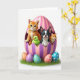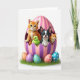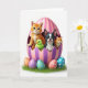 This card shows a spring scene with a giant striped egg in pink and lilac, its cracked top forming a cozy nest for a group of friendly little animals. In the center, an orange‑striped kitten with bright green eyes leans forward with a gentle smile, as if inviting the others closer. Beside it, a small green chick presses in companionably, while a black‑and‑white puppy with upright ears and a tiny tongue showing looks outward like it’s posing for a group portrait 🐰. A smaller golden kitten peeks from the side with a shy, affectionate glance that makes the cluster feel like close friends sharing a secret. The background stays plain white, keeping the focus on the soft pastels and the plush, rounded shapes of the characters. Near the bottom, several decorated eggs with polka dots in apricot, violet, and blue rest in textured green grass, and the greeting text sits along the lower area in a light purple color with a simple, easy-to-read style 🌷. The egg’s jagged rim is shaded to look slightly raised, with glossy highlights on the stripes and patterned shells.