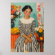 A vibrant, vintage-style painting of a poised woman in a black-and-white striped dress, seated between two colorful floral arrangements and fresh fruits. The scene radiates charm with bold colors, expressive brushstrokes, and a nostalgic, post-impressionist aesthetic reminiscent of Matisse.