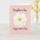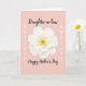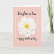This greeting card features a softly shaded white flower with layered petals at the center, set against a gentle blush-pink background that feels calm and affectionate ❤️. The petal edges are lightly shadowed, giving the bloom a tender, touchable depth, while the golden-yellow center glows like a warm shared moment. Two slim white vertical accents on the left and right resemble delicate sprigs or decorative arrows, quietly framing the flower like a pair standing close together. Flowing black text sits above the bloom as a short headline, and a second line of matching black text rests below, balancing the layout. The contrast between the dark lettering and the pale background keeps the message easy to notice without overpowering the artwork. Small details in the petal shapes and the soft color transitions add a gentle romantic tone, like a lingering gaze between close friends 🌼. The flower’s center is a sunny yellow circle with tiny textured marks, surrounded by crisp white petals that fan outward in layered rings.