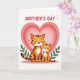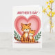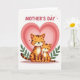 This card features two stylized cats in warm orange and brown tones, with dark stripes and rounded shapes that keep the scene soft and friendly. A larger cat sits close beside a smaller one, their bodies leaning together as if sharing a quiet, caring moment ❤️. Both have closed eyes and faint smiles, giving them a tender, affectionate look that reads like family closeness or gentle friendship. Behind them, layered heart shapes spread outward in rings, shifting through pale pink shades to frame the pair like a cozy embrace. Leafy green plants peek in from the left and right edges, adding a natural touch and balancing the warm colors. Near the top, a short greeting appears in thick, rounded letters, set in a darker pink and spaced to sit above the cats, with a few tiny heart marks nearby 🌼. The background shows concentric pink hearts radiating from behind the cats, with green foliage at the sides and the message centered above.