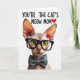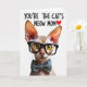 This card features a stylized hairless cat-like figure centered on a bright white background, staring forward with big golden-yellow eyes that catch the light in a gentle, affectionate way ❤️. The cat wears thick black-framed glasses that add a studious, slightly cheeky look, as if it’s sharing an inside joke with someone it adores. A neatly tied gray bow tie sits at the neck, giving the character a dressed-up, caring presence that feels like a warm nod of appreciation. Above the portrait, the message “YOU’RE THE CAT’S MEOW MOM” is set in modern, all-caps lettering in black, making it easy to read at a glance. A small red heart appears near the wording, adding a sweet visual cue without crowding the layout 🌼. Soft, even lighting highlights the smooth skin texture, including tiny creases and faint stripe-like markings across the forehead. The close-up composition keeps everything intimate and focused, with the cat’s large ears framing the face against the plain white space. Subtle shading inside the ears and around the eyes adds depth while the background stays completely white and uncluttered.