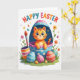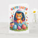 This card features a bright orange, striped cat with big blue eyes and a gentle smile, peeking out from a large split egg-shaped container as if sharing a sweet secret with the viewer 🐰. Around it, many smaller shiny eggs sit across a rich green grassy foreground, decorated with dots, stripes, and zigzag patterns that feel like they were made with care for a close friend. A tall paintbrush with red bristles leans near a small pot of purple paint, hinting at a cozy craft moment where someone took time to decorate things for another. Soft light spreads evenly across the scene, making the pastel tones and primary colors look smooth and inviting 🌷. Small pink and orange flowers bloom near the bottom, while tiny star-like accents float in the background like little sparks of attention. The words “HAPPY EASTER” appear across the top in large, multi-colored letters, standing out clearly against the lighter backdrop. The central egg container is detailed with decorative patterns along its edges, framing the cat’s face as it peeks from the opening.