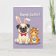 This card features two human-like animal friends centered on a smooth lavender background, their bodies angled slightly toward each other as if sharing a quiet joke 🐰. On the left stands a light-furred, short-snouted dog with wide eyes and a thoughtful look, wearing oversized bunny ears with pale pink inner lining and a red bow tie. Beside it is an orange tabby cat with soft stripes and an open, happy expression, leaning in close with a gentle, companionable warmth. A small crown of flowers in pink, yellow, and white with green leaves rests around the cat’s head, adding a springtime touch 🌷. The cat holds a decorated egg with blue-and-white swirling stripes at chest height, as if showing it proudly to the dog. Above the pair, a holiday greeting appears in white, set near the top center in a serif-style font that stands out against the lavender. Light shading sits beneath their feet, and the floral wreath shows tiny petals and leaves layered around the cat’s face.