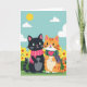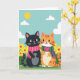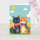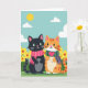This card shows two stylized, humanlike cats standing close together in a sunny outdoor scene, their gentle smiles and shared gaze hinting at friendship with a touch of romance ❤️. In the center, a sleek black cat with bright green eyes and a small pink nose stands beside an orange-striped cat with a white muzzle and belly. Each wears a cozy scarf, with the black cat in pink stripes and the orange cat in green-and-purple stripes, and a small pink heart emblem sits on the orange cat’s chest. Above them, the sky is turquoise with a round yellow sun and two soft white clouds, keeping the mood light and affectionate. A short line of text sits near the top in a simple pink font, leaving the characters as the main focus. Along the bottom, a second line of text appears in a darker green, nestled just above the grass. The ground is a bright green field sprinkled with yellow flowers with orange centers 🌼.
