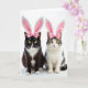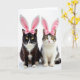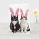 The front design shows two domestic cats posed side by side on a bright white background, their steady gaze giving the scene a calm, close-knit feel 🐰. Each cat wears soft white bunny ears with pale pink centers and a rosy bow perched near the top, adding a sweet, dress-up look without overpowering their faces. On the left sits a sleek black cat with a sharp white blaze on the chest and white paws, leaning slightly toward its companion as if sharing the spotlight. On the right is a tabby-and-white cat with fine stripes across the head and back and a wide white chest, meeting the other cat’s eyes with a gentle, friendly focus 🐇. Their large golden eyes catch the light, and the soft pink noses echo the pink accents in the ears and bows. The Easter greeting text sits near the top in a soft pink tone, with smaller wording placed below in a lighter shade for balance. Diffused lighting smooths the fur textures and leaves faint shadows beneath their paws on the white surface.