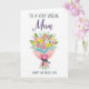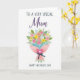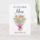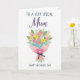 Designed with a bright floral bouquet on a white background, this card centers on a clustered arrangement of blossoms in soft pinks, yellows, oranges, and light blues. Green leaves weave between the flowers, giving the bouquet a lively, just-picked look that feels like a caring gesture between close loved ones ❤️. The stems are wrapped in pale pink paper set at a gentle diagonal, adding a relaxed, affectionate tilt to the composition. A deep blue ribbon is tied into a neat bow near the base, offering a calm contrast to the warm petals. Near the bouquet sits a strong pink heart shape with a smaller white heart inside, like a quiet sign of closeness and appreciation 🌼. Text is placed above the bouquet in a flowing, elegant style, while a simpler line of text sits below in a straightforward print, both in dark lettering for easy reading. The bouquet wrap angles from lower left to upper right, with the blue bow resting slightly off-center beneath the flowers.