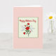 This card features a soft square frame in muted forest green set against a light cream field, creating a calm stage for a romantic floral scene. In the center, deep red roses appear in mixed bloom and bud, their layered petals shaded to look plush and full ❤️. Twined through the stems and leafy greenery are two white birds with gently opened wings, angled toward each other as if sharing a quiet, affectionate moment. Their bright feathers stand out against the crimson flowers, adding a peaceful contrast that reads like closeness and care. Above the framed artwork, a short greeting sits near the top in flowing red lettering that matches the roses, drawing your eye down into the bouquet. A soft blush-pink area surrounds the framed square, warming the overall palette and giving the design a friendly, intimate feel 🌼. The green frame has crisp edges, and the birds’ wings show light gray shading along the feather tips.