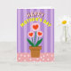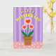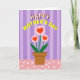 The front design shows a centered potted plant arrangement that feels like a small, affectionate gift set on a table ❤️. Three stylized blossoms sit at the top, each made of soft pink scalloped petals with a red heart shape in the middle, like they’re quietly sharing love with whoever looks at them. The flowers rise on slim green stems from a rustic, earthy-colored pot that grounds the scene in a cozy, homey way. Curving above the bouquet is a cheerful greeting, with the first word in bright white letters outlined in red, followed by the main phrase in sunny yellow with a thin white edge. The arched text wraps around the flowers like an embrace, adding a gentle sense of closeness and friendship. Behind everything, the background alternates vertical stripes in light lavender and deeper violet, giving the design a calm, dreamy setting 🌼. Along the bottom, a blush-pink surface dotted with small white polka dots reads like a tabletop beneath the pot.